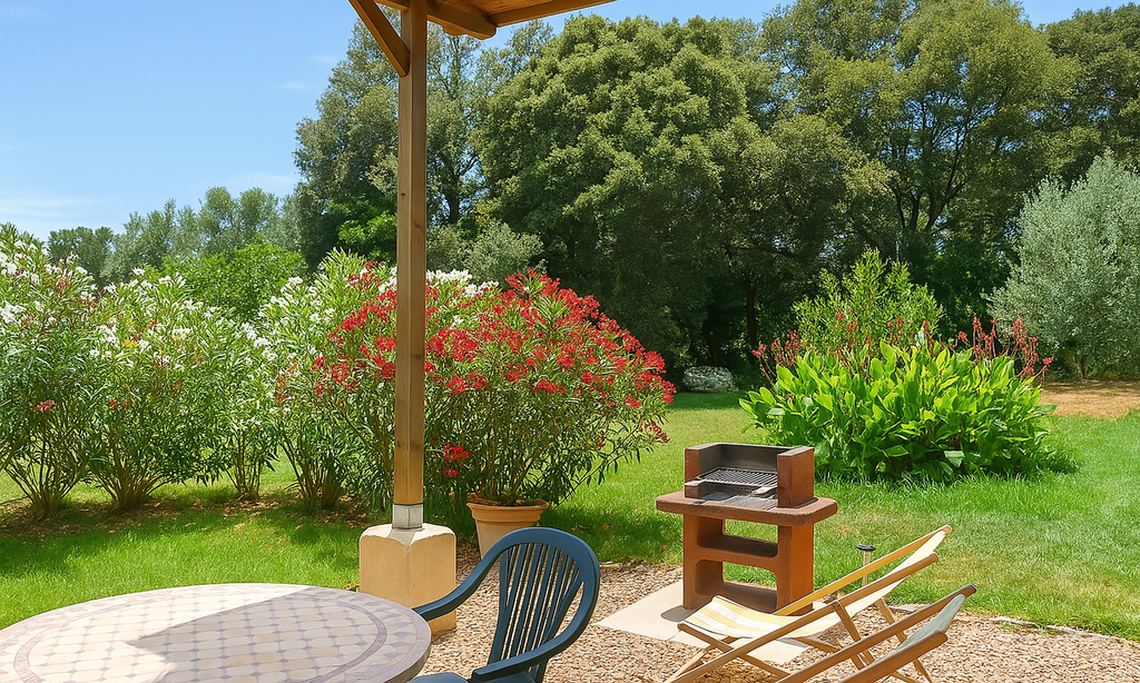 Terrasse couverte (pergola) avec salon de jardin, chaises longues et barbecue individuel. De plus vous avez accès à un grand jardin avec hamacs, Ping-Pong, Badminton, boules de pétanque.