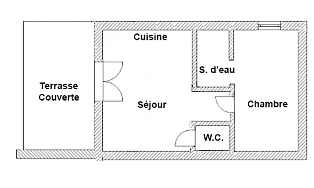 Séjour, cuisine américaine, une chambre, salle de bain, WC indépendant, terrasse avec barbecue individuel, jardin privatif, parking.