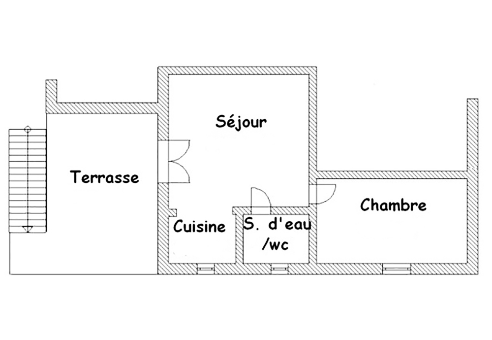 Séjour, cuisine, une chambre, salle de bain/WC, terrasse avec barbecue individuel, parking.