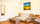 Séjour avec canapé clic-clac en 140 (matelas latex), TV LCD 80 cm et espace repas.
